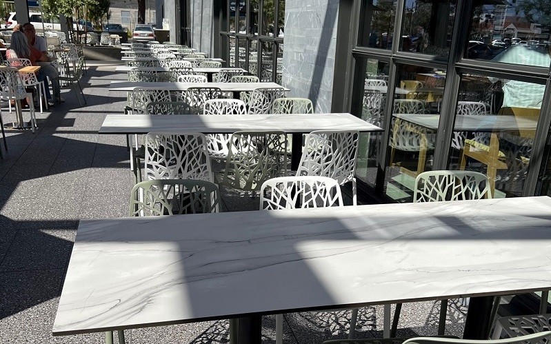 Porto’s Bakery and Cafe’s newest location in Northridge features our Compact HPL Laminate Tops in a Faux Carrara Finish with our Monique Vintage Series Tablebases custom powdercoated for outdoor use giving the patio an old world, traditional look.