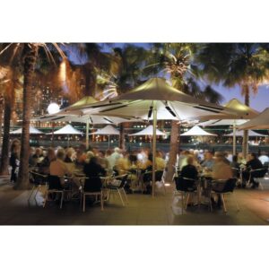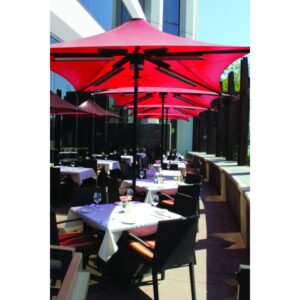 The innovative Umbrella System is a great solution to difficult heating problems associated with the outdoors, providing all weather protection, comfort and appeal. The system employs Electric Radiant Heating and Lighting integrated into the permanent membrane structure. The umbrella is made of heavy duty steel construction with a tropical grade membrane sheltering the elements and blocking harmful ultraviolet rays.