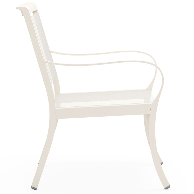 The Scala Collection Sling Dining Chair combines art deco inspired design with modern comfort and boho vibes. The fishscale like accented back adds elegance to any outdoor dining or lounge space. The Scala collection is made to order with a variety of frame finishes and upholstery. Add some panache to your golf and country club, hotel or restaurant lounge, or communal area while giving guests comfort and quality