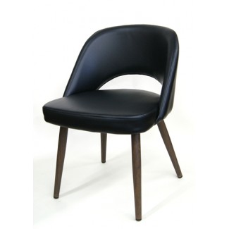 The Jetson dining chair will make you zip back in time! The clean lines and curves are inspired by mid century design, paired with a vibrant orange, black or white vinyl upholstery and walnut colored tapered legs. The frame is made out of metal and powdercoated to look like wood with a matte finish. In stock, priced well, and comfy, the Jeston is a perfect way to add a pop of color and a dash of style to your restaurant.